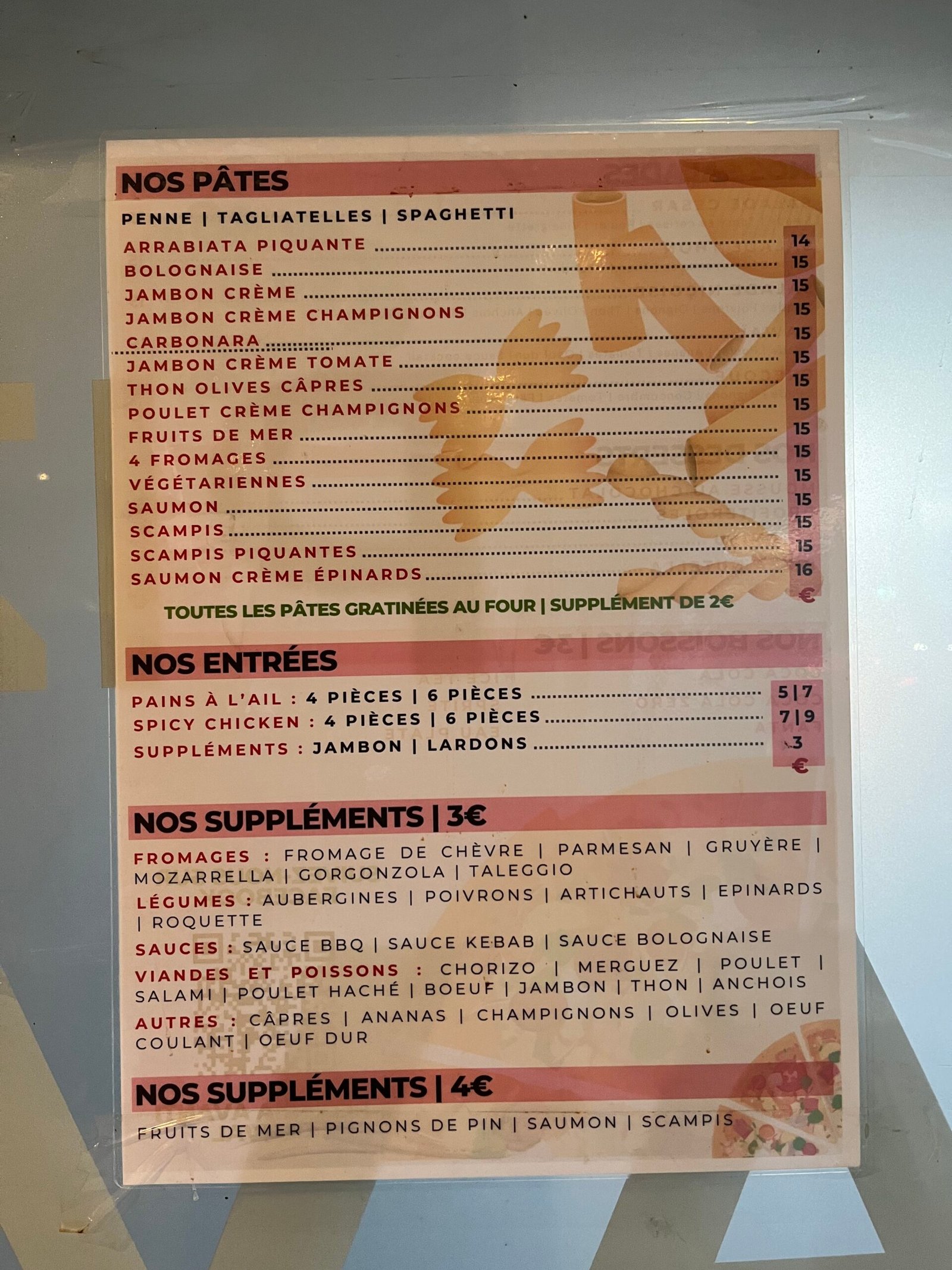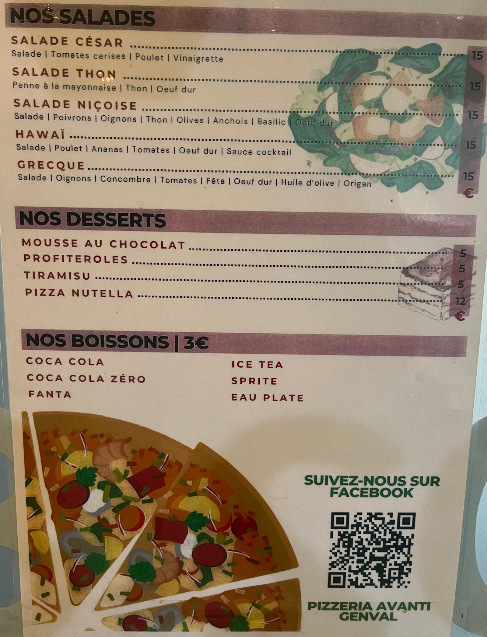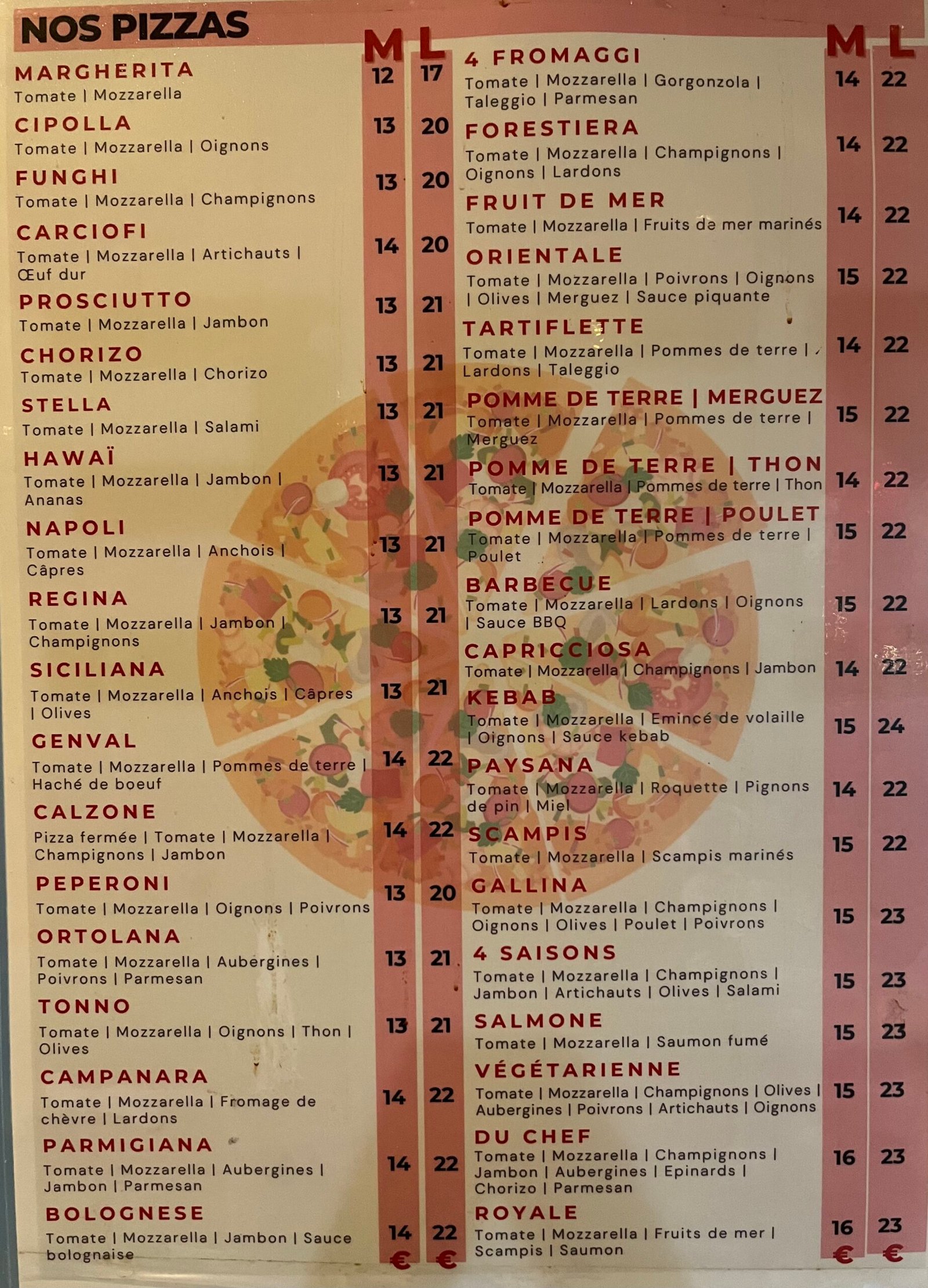 Pizzas M/L, entrées, plats de pâtes, desserts et boissons